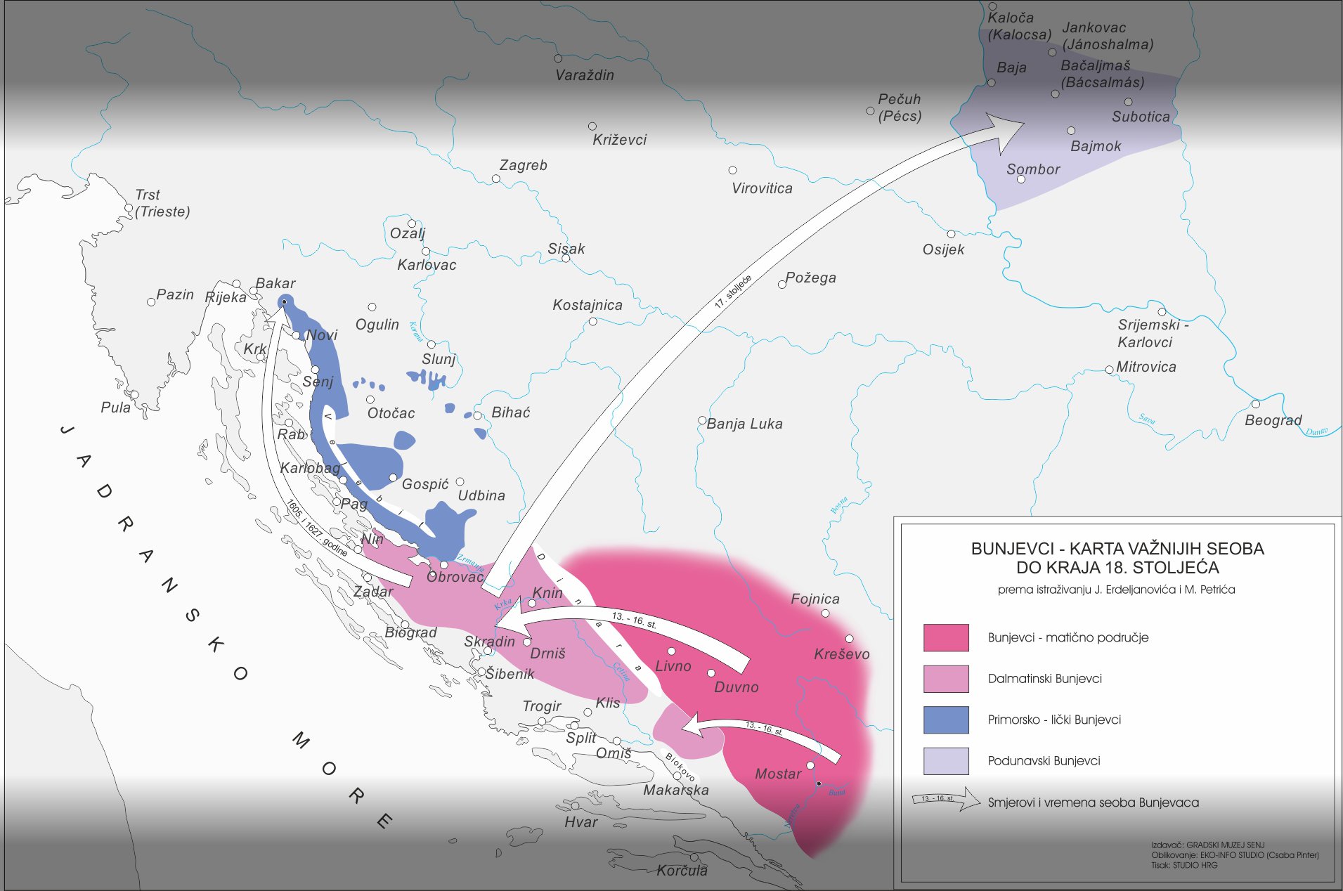 Bunjevci - karta važnijih seoba do kraja 18. stoljeća