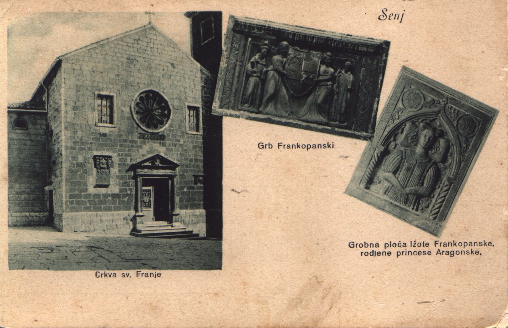 Prednja strana razglednice prikazuje dijelove crkve Sv. Franje (crkva je uništena 1943./1944. godine u Drugom svjetskom ratu). Od nje je danas ostao samo zvonik koji je bio dio samostana i matične crkve uskoka. Prikazane su tri fotografije: prva je ulaz u crkvu (koji danas ne postoji); druga prikazuje frankopanski grb (Frankopani su bili graditelji i donatori crkve), a treća je grobna ploča „Ižote Frankopanske, rodjene princese Aragonske.“ Uz potpise slike, otisnute crnim slovima, također je na isti način otisnuto „Senj“. Fotografije su zelenkaste s bijelim rubom.