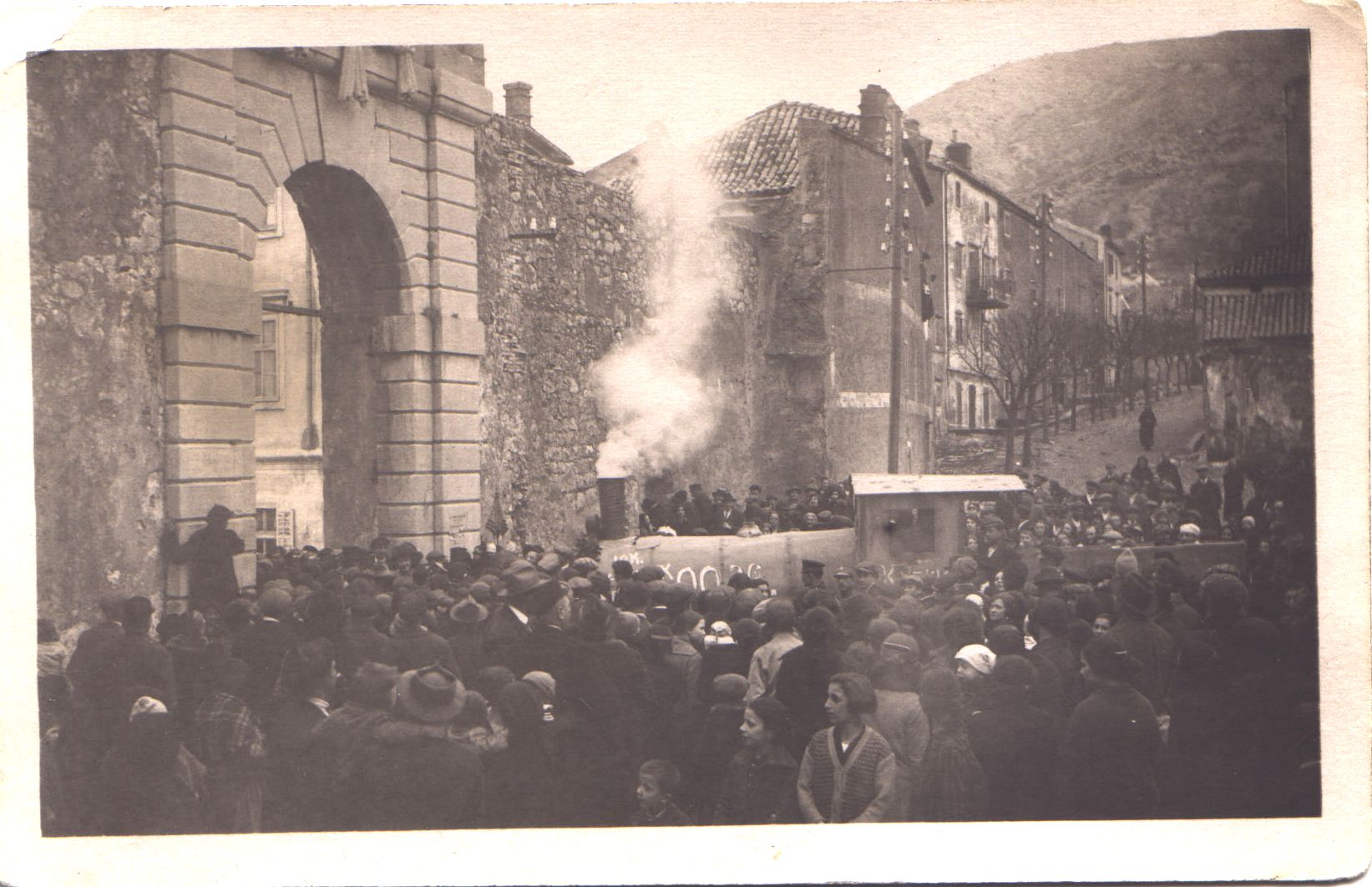 Prednja strana razglednice ima na sebi fotografiju kod Velih vrata (s vanjske strane). Prikazuje "dolazak vlaka i željeznice do Senja". Unatoč silnim obećanjima i nastojanjima nikad nije izgrađena, pa su je zato i stavili u maškare/karneval. Fotografija je crno-bijela i uokvirena je bijelim rubom