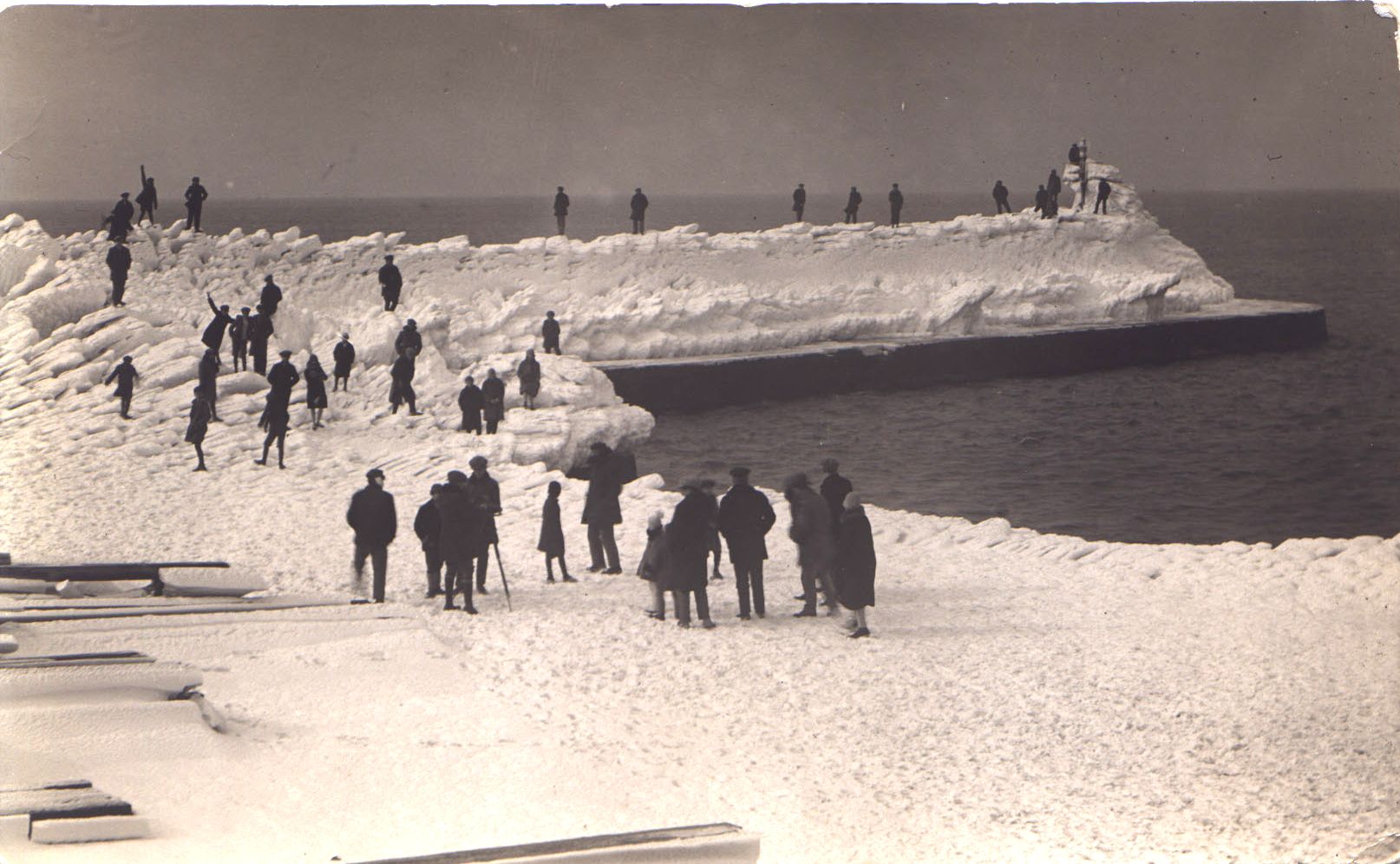 Razglednica na prednjoj strani ima crno-bijelu fotografiju Arta po zimi. Vidi se drvena građa pod snijegom i ledom, ljudi koji uživaju u snježnim radostima i svjetionik koji je također prekriven snijegom.