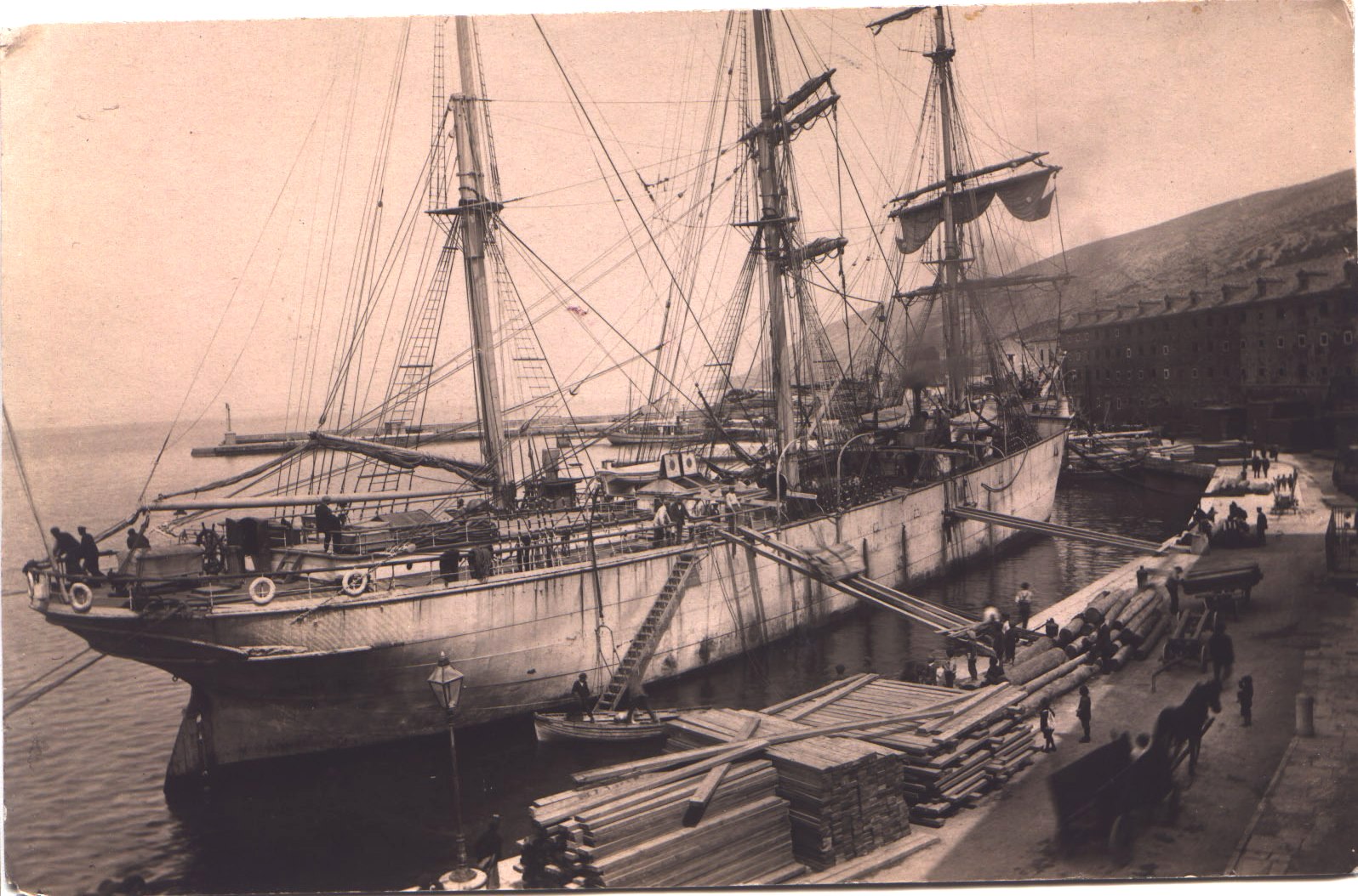 Razglednica na prednjoj strani ima crno-bijelu fotografiju jedrenjaka vezanog u senjskoj luci na koji se krca drveni teret i putnici.