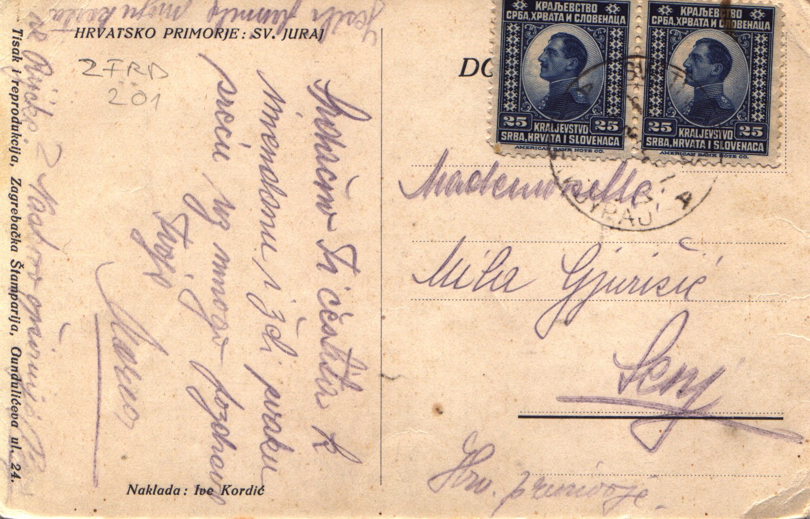 Poleđina je podijeljena na dio za pisanje teksta i na dio za adresiranje. Razglednica je putovala. Poleđina je ispisana olovkom.
