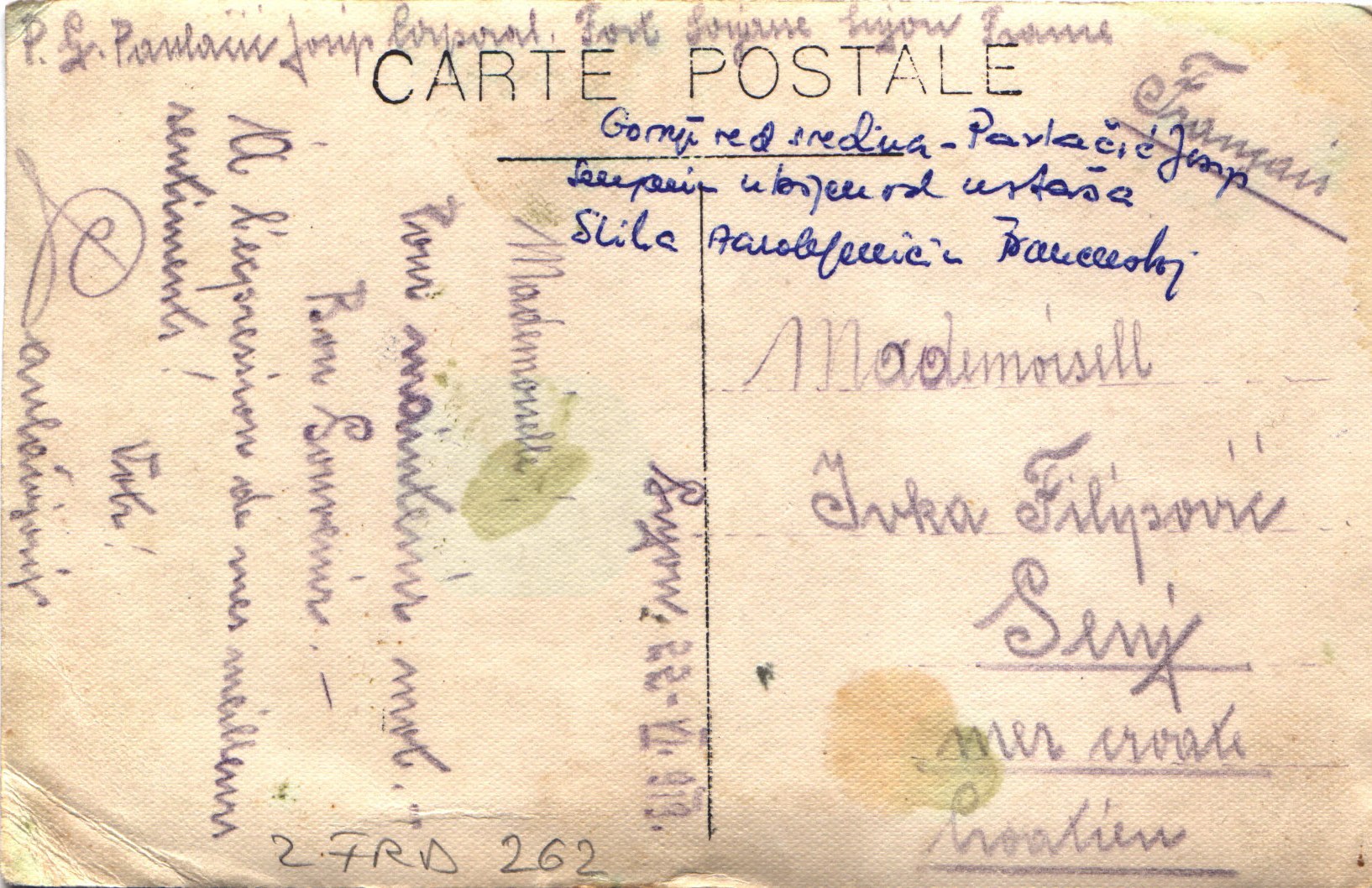 Poleđina je ispisana. Otisnut je natpis CARTE POSTALE. Razglednica je putovala. Primateljica je bila Ivka Filipović. Za jednu osobu na fotografiji se zna identitet jer je na poleđini navedeno ime i prezime (Pavlović Josip - gornji red).