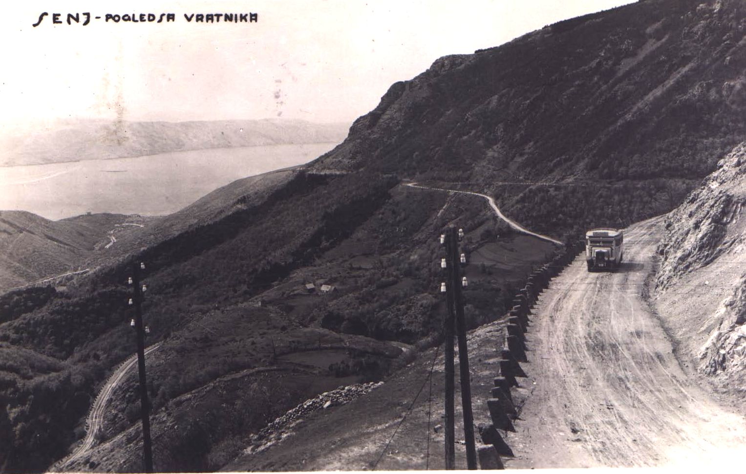 Prednja strana prikazuje fotografiju autobusa koji se penje uz Vratnik,u pozadini uz more može se vidjeti Senj. Na prednjoj strani je otisnuto štampanim crnim slovima: Senj, pogled s Vratnika.