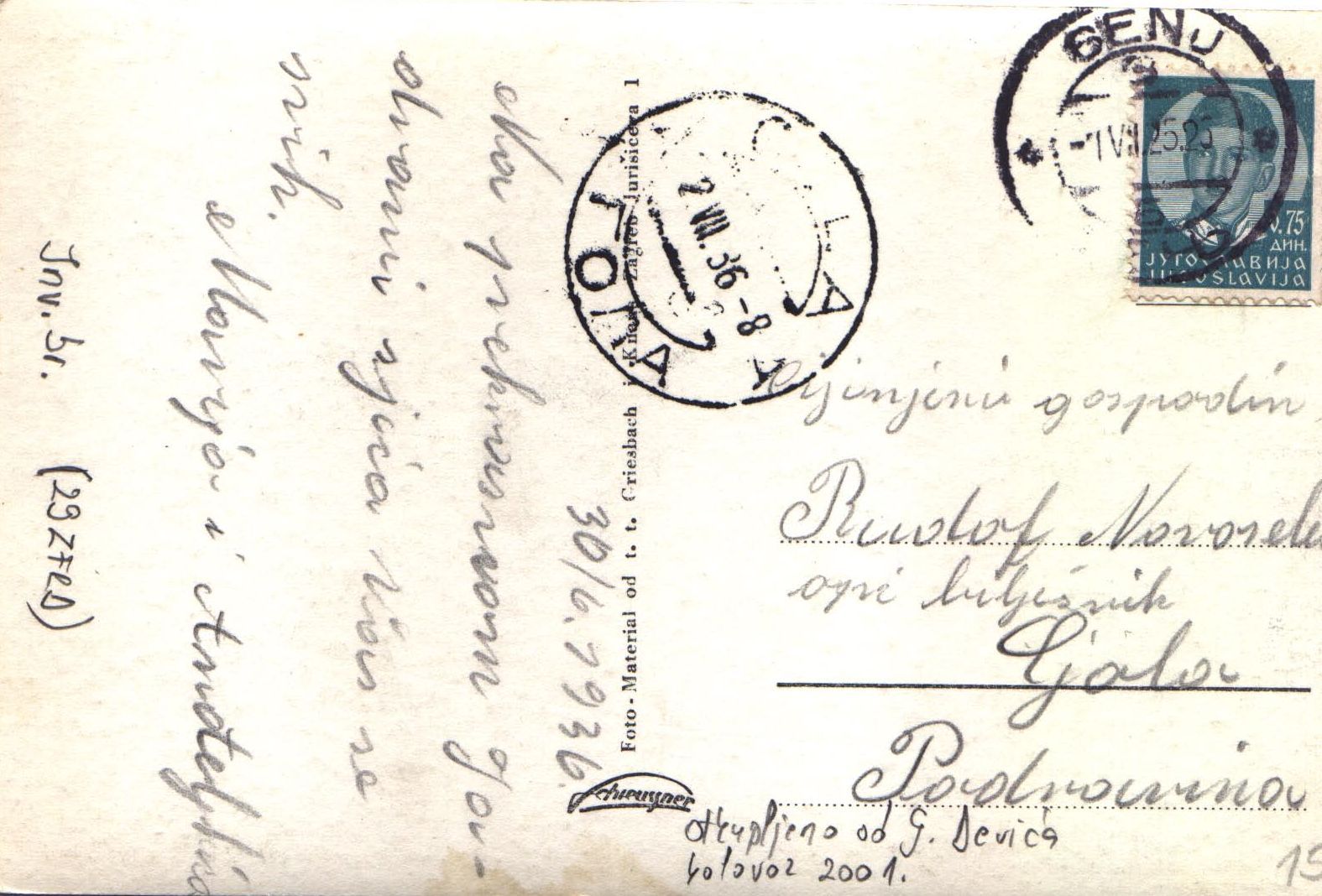 Razdijeljena je na dva dijela, prvi za adresiranje, a drugi za upis podataka. Poslana je iz Senja u Podravinu. Tekst i adresa pisani su olovkom (8.7.1936-8A je primljena-pečat pošte primitka). Vidljiv je i čitljiv pečat pošte Senj. Poštanska marka sa slikom Kralja Petra je u vrijednosti od 75 para.