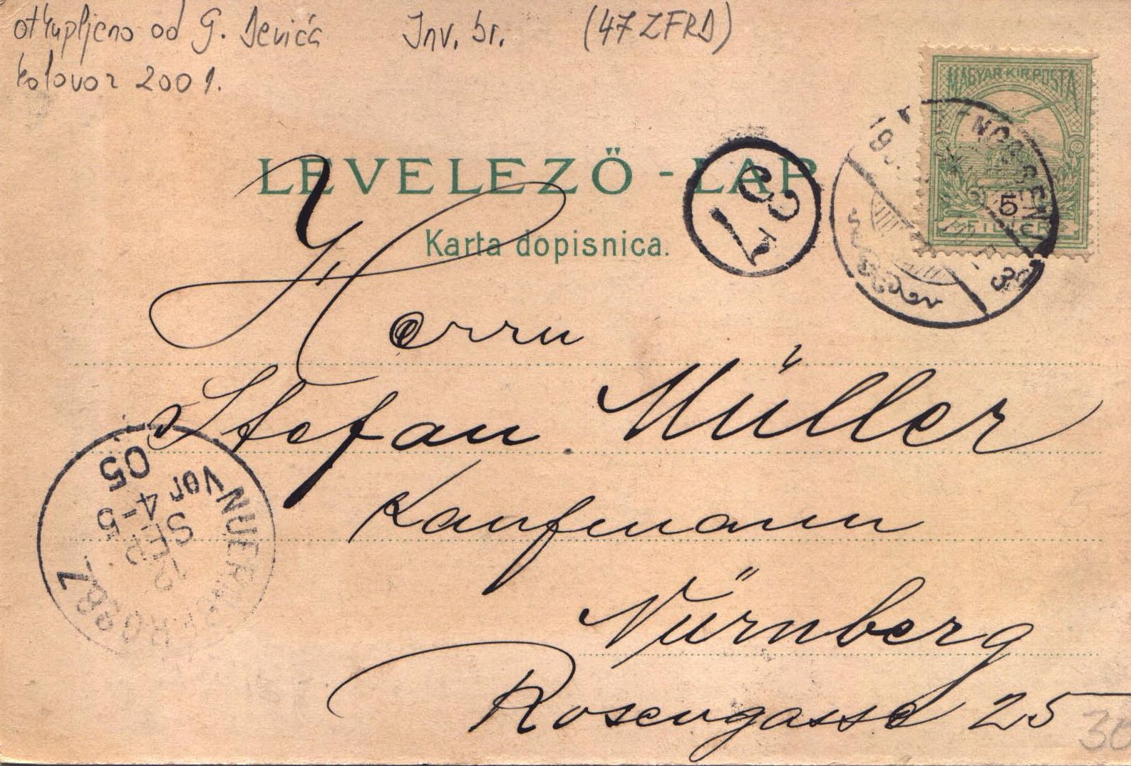Na poleđini je ispisano: "Stefan Muller,Nuerberg". Putovala je u maju mjesecu 1905. godine. Na sebi ima pečate pošte u Senju i u Nuerbergu. Poštanska marka Magyar kir posta od Fillera je zaljepljena na poleđini. Zelenim slovima je otisnuto: "Levelezo-lap, karta dopisnica". Ima na sebi i pečat sa brojem 37 (oznaka pod kojoj je najvjerojatnije putovala do Nuerberga).