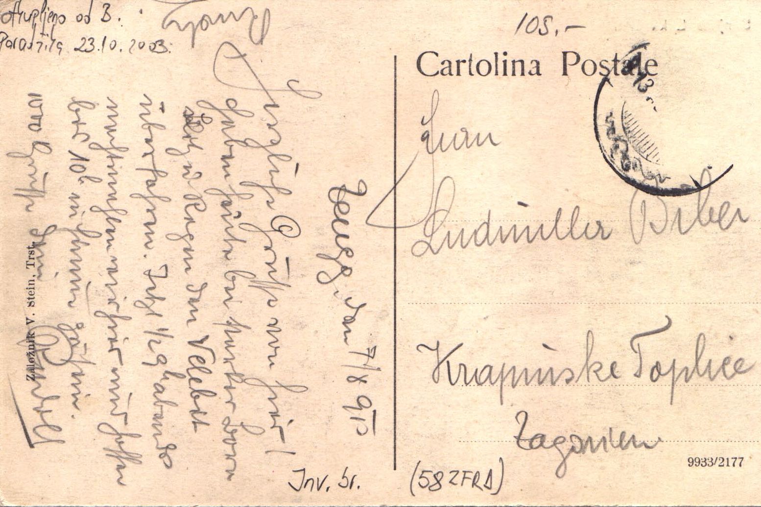 Na poleđini je crnim slovima otisnut broj 9933/2177, Cartolina postale. Podijeljena je u dva dijela prvi za adresiranje, a drugi za pisanje teksta. Sav tekst koji piše na poleđini napisan je olovkom. Na sebi ima poštanski pečat bez poštanske marke. Trebala je putovati u Krapinske Toplice.