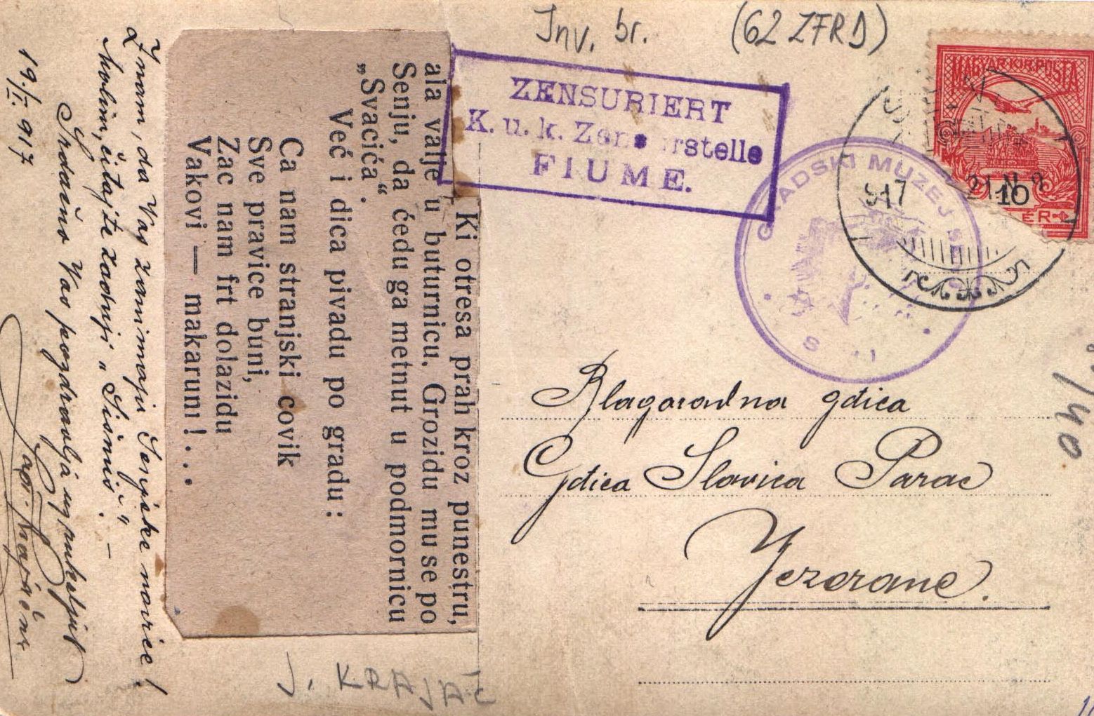Razglednica je pisana 17. siječnja 1917., a iz Senja je otpremljena 21. siječnja 1917. na adresu Slavice Parac u Jezerane. Na većem dijelu mjesta za pisanje teksta nalijepljen je isječak iz novina (Šišmiš) s tekstom i pjesmom podrugljivoga karaktera. Pošiljatelj je Ladislav Krajač. Razglednica je datirana prije 19. siječnja 1917.