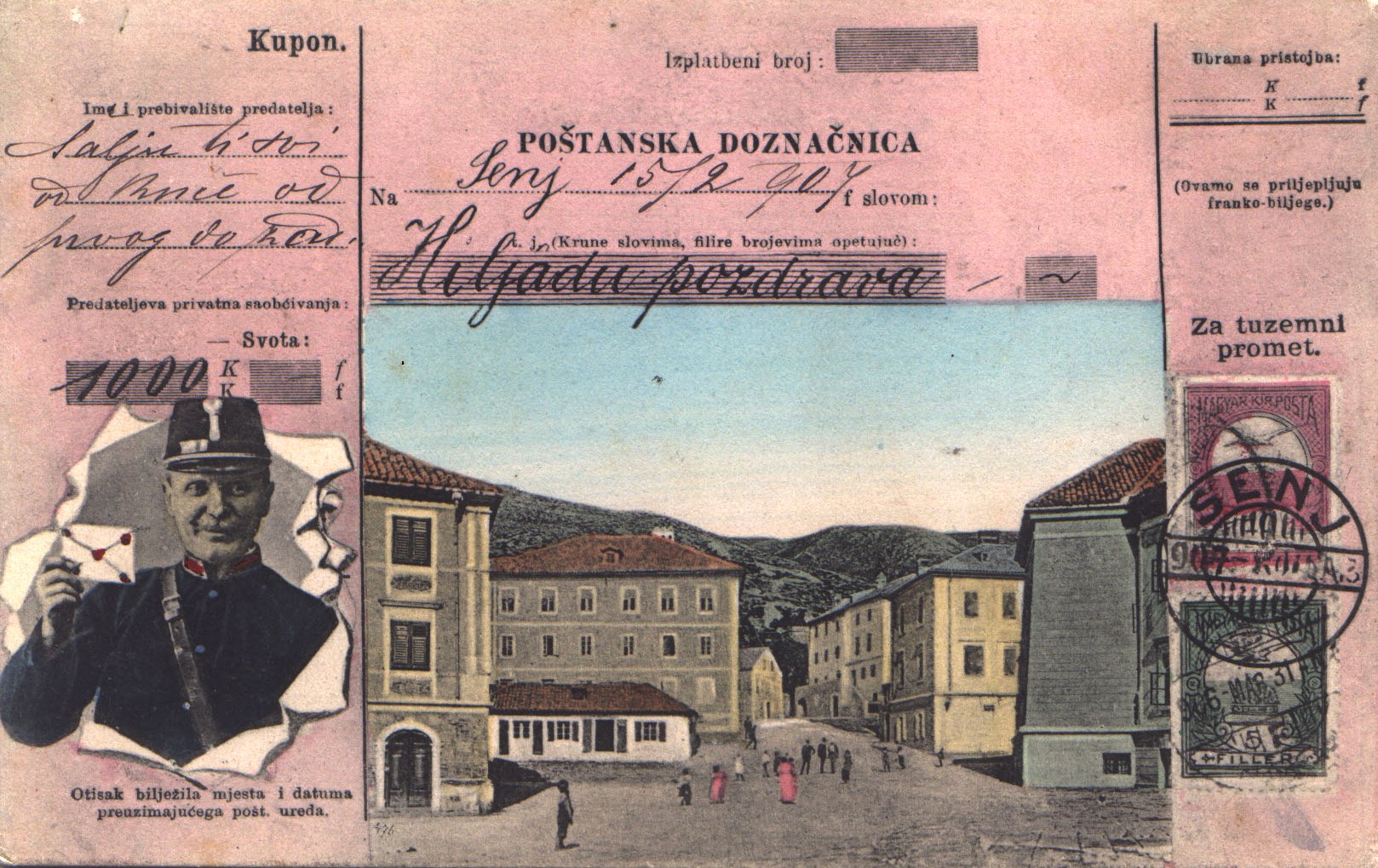 Prednja strana razglednice podijeljena je u tri dijela: veći centralni i dva manja sa strane. U centralnom je dijelu fotografija Senja (stara gimnazija, pošta i dio Kaštela), a iznad nje je datum 15. veljače 1907. S lijeve strane je fotografija pismonoše s pismom u ruci, a s desne je marka s poštanskim žigom senjske pošte. Nakladnik je tiskara Devčić & co., u kojoj je vjerojatno otisnuta i cijela serija.