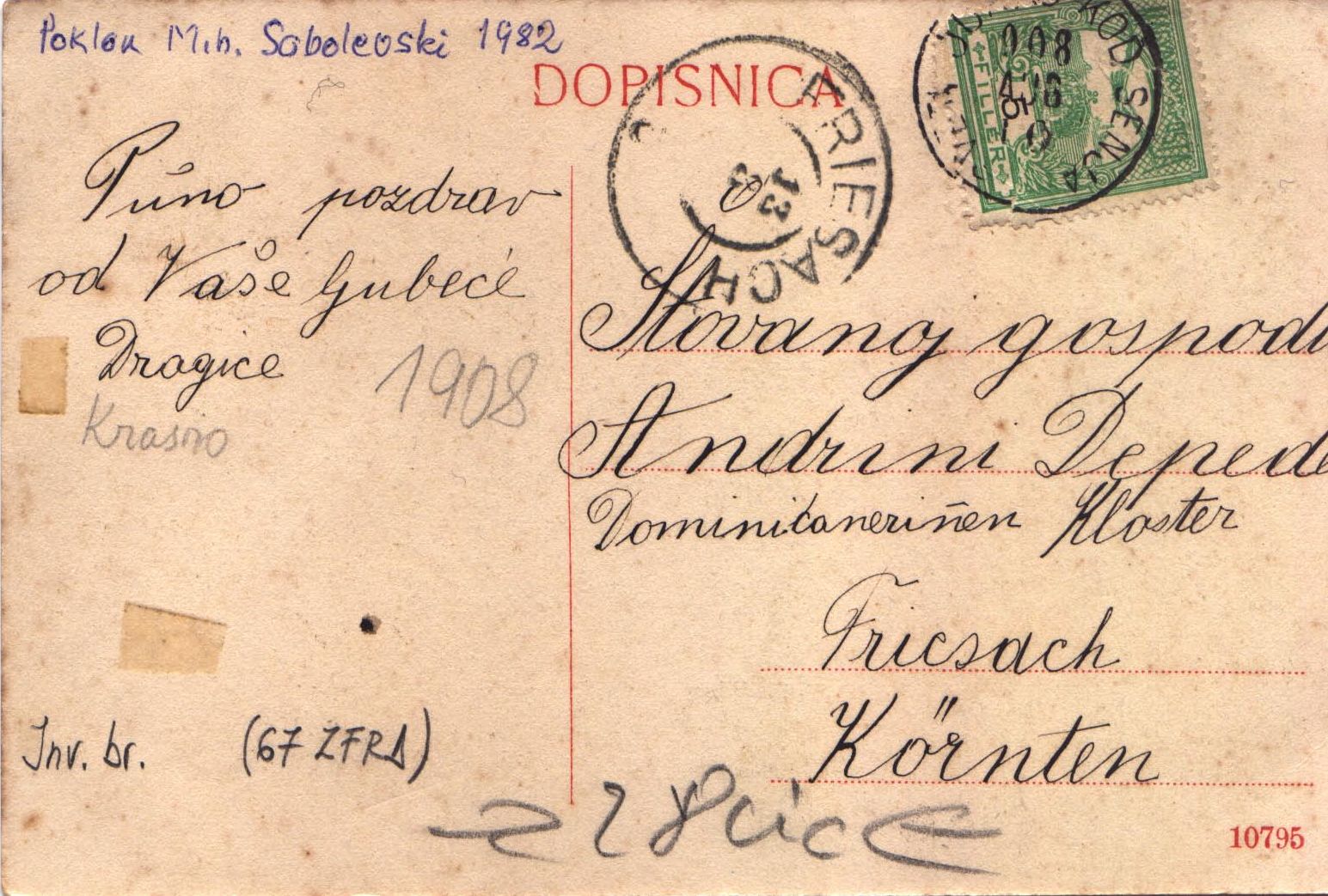 Na poleđini je upisana adresa primateljice s pečatom pošte u Krasnu i prijemne pošte Friesach. Razglednica je putovala 1908. godine.