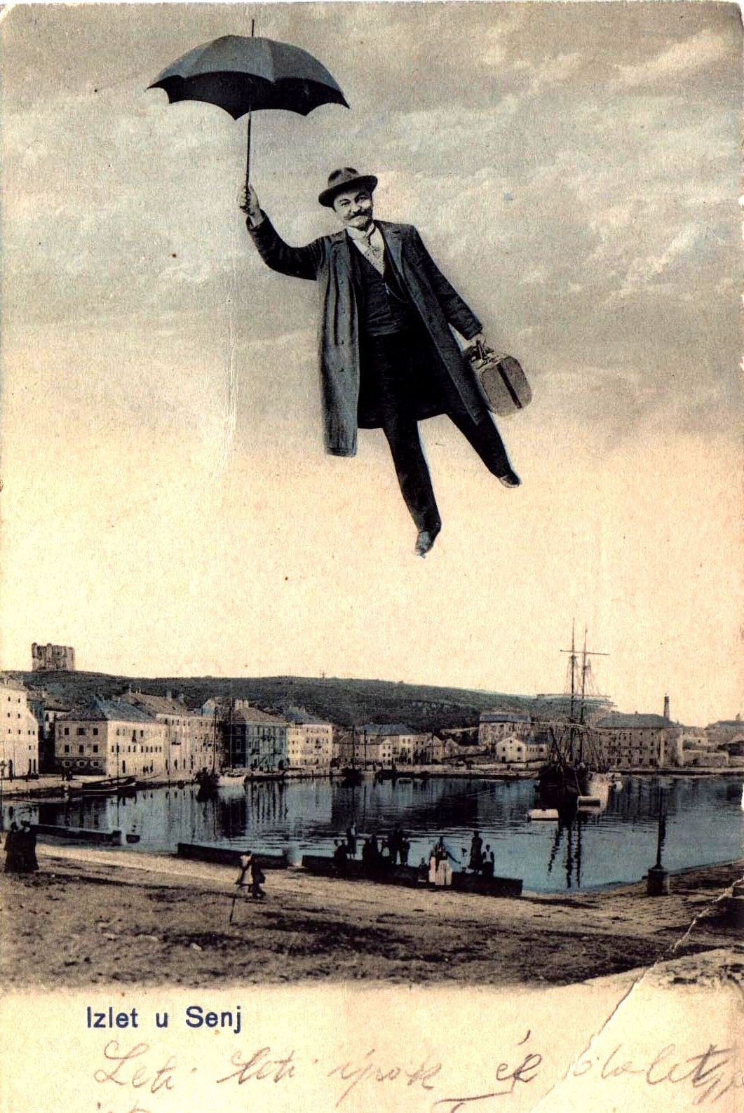 Dopisnica na prednjoj strani ima koloriranu fotografiju senjske luke i fotomontažu čovjeka koji je u Senj doletio s kišobranom i kovčegom. Plavo otisnutim slovima napisano je „Izlet u Senj“, a olovkom je nadopisano „leti, leti, gdje će sletjet. Tonka“.