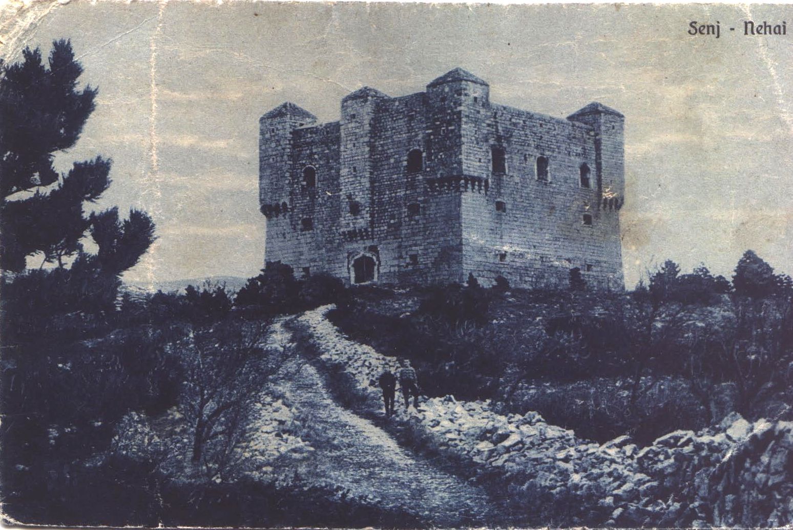 Prednja strana razglednice ima na sebi fotografiju tvrđave Nehaj i dvoje djece ispred nje. U gornjem kutu je crnim slovima otisnuto Senj-Nehaj.
