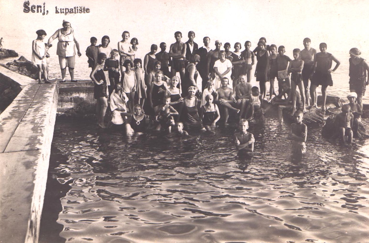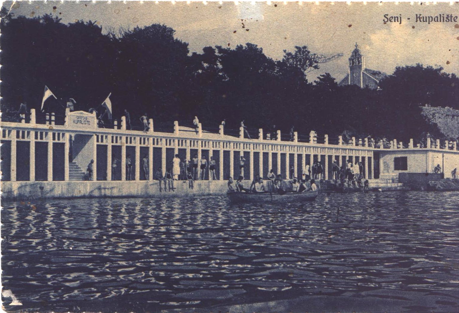 Prednja strana prikazuje fotografiju kupača na Gradskom kupalištu Senj. Crnim je slovima otisnuto "Senj, kupalište".