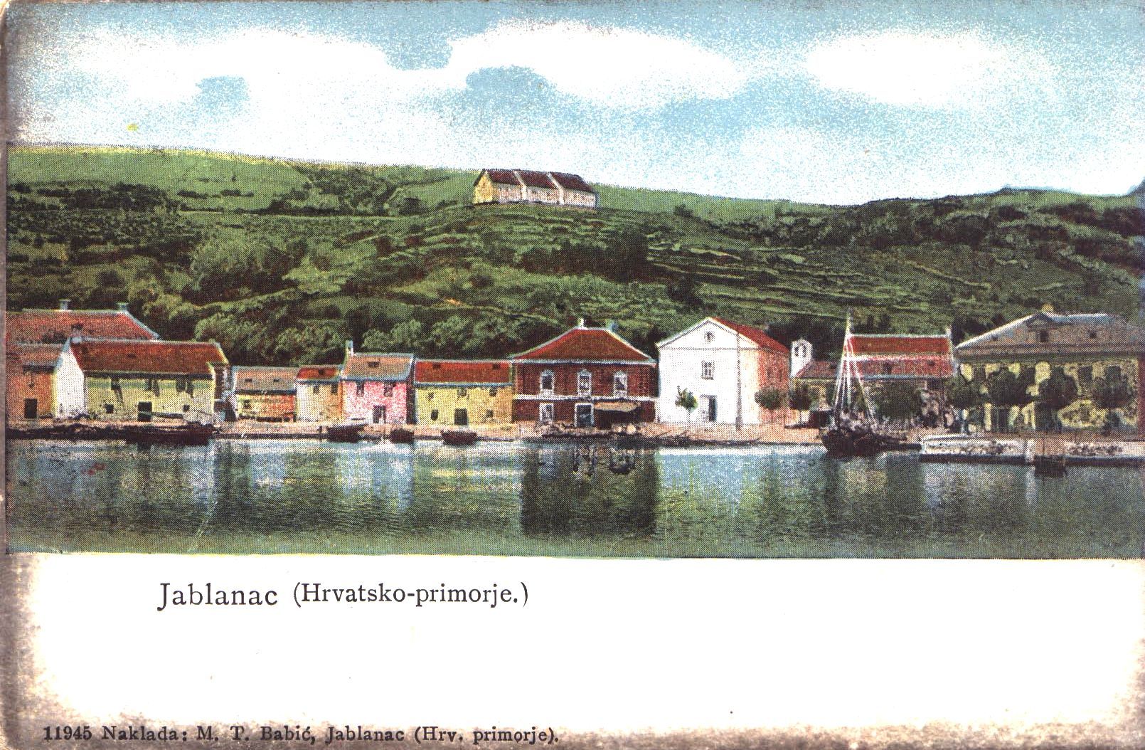 Prednja strana dopisnice ima na sebi kolorirani prikaz djela Jablanca. Pokriva samo dio prednje strane. Donji dio prednje strane je bjel i na njemu je crnim slovima otisnuto Jablanac (Hrvatsko-primorje), 11945 Naklada, M. T. Babić (Hrv. primorje).